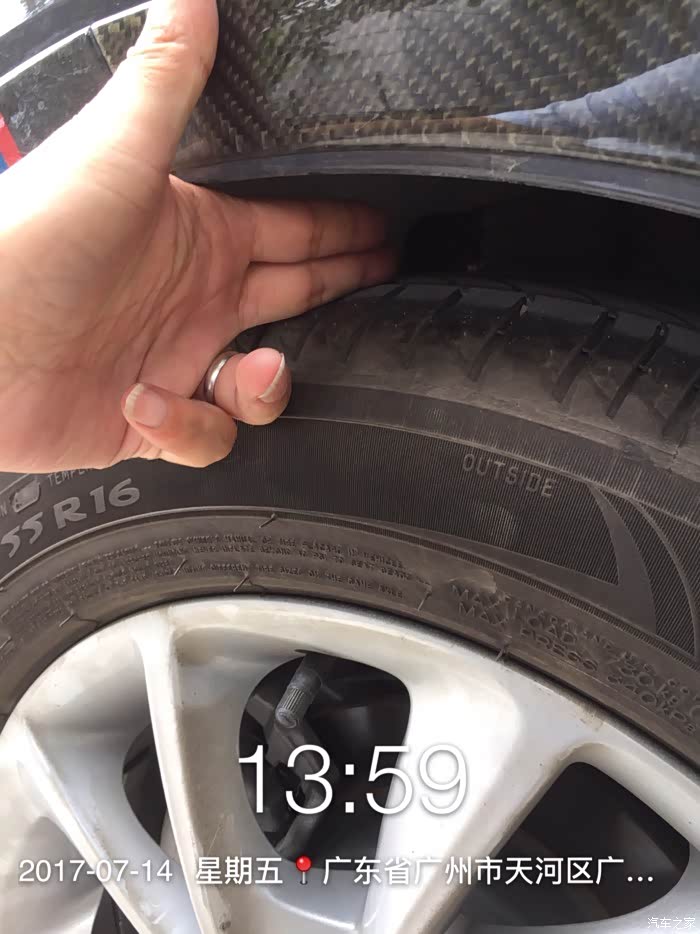 4、四轮胎由原车的205/55 R16 91V固特异御乘二代轮胎换成215/55 R16 97W米其林浩悦轮胎,换过之后轮子宽了1厘米,大了1.1厘米。原车轮毂是7.0J的,其实最适合的胎宽是215,而不是原车的205。有人担心里程表和速度表的问题,我定速50简单测试了一下:原来的表速50实际47-48左右,换胎后实际49-50左右,其实原车的表速是比真实速度要大的,换了胎反而更接近真实速度。3000块