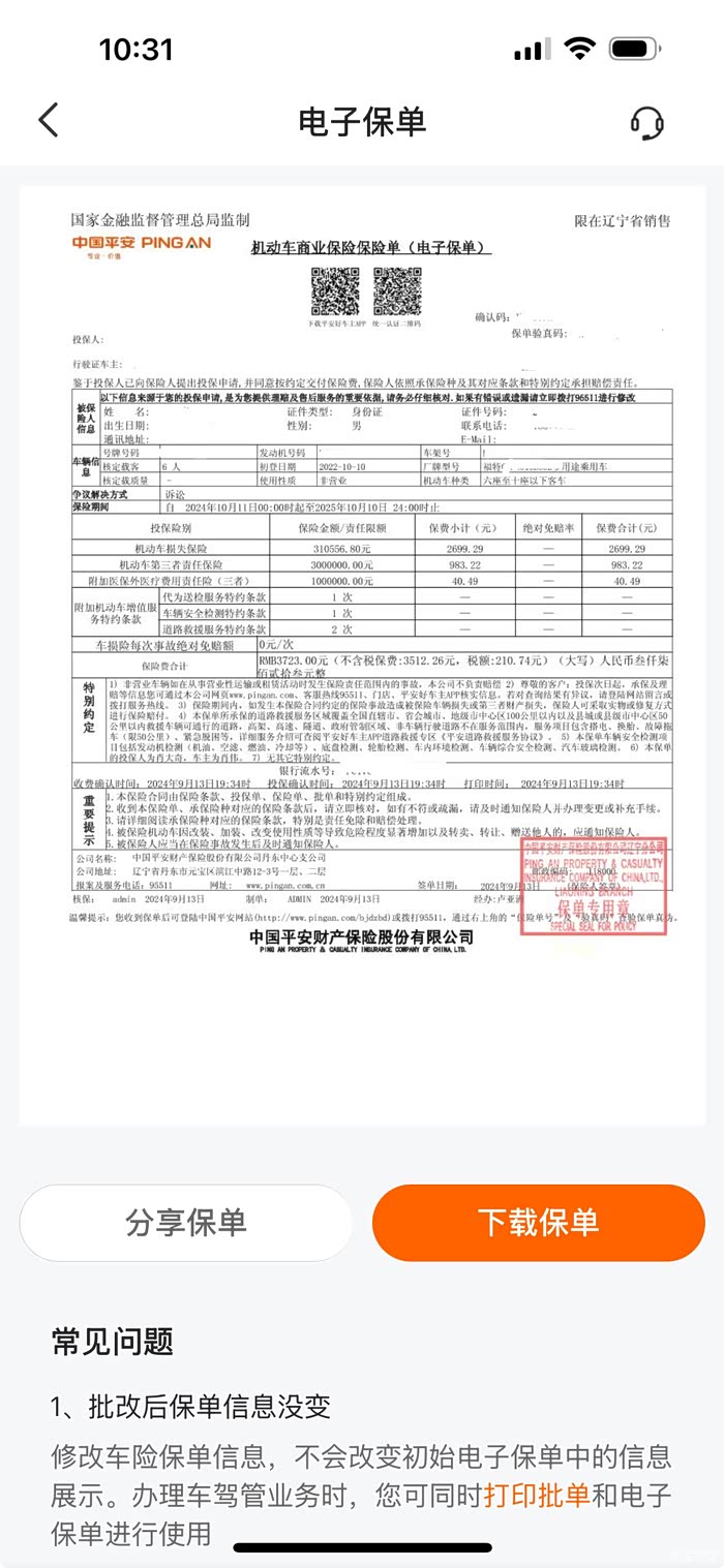 保险费:2024 年的车险保费总计 4603 元,其中 880 元为交强险,这是上路必备的基础保障费用。而商业险部分则花费 3723 元,包含了保额高达 300 万的第三者责任险以及车损险等重要险种,为车辆在行驶过程中的各种潜在风险提供了较为全面的防护网。