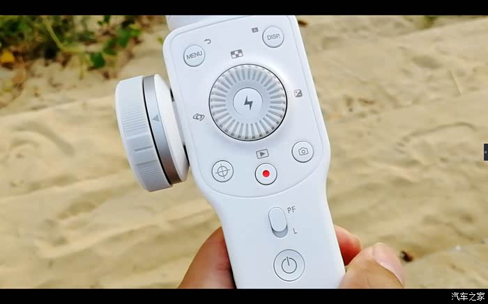 居中是一个可顺时针/逆时针 拨动的转盘,可以滚动选择APP里面的功能、参数等,事实上转盘的上下左右隐藏设计有四个功能按键,分别是分辨率选择、镜头切换、媒体库、以及曝光补偿按键,中间带有闪电符号的是确认/补光灯按键,长按可开启/关闭手机的补光。控制面板的四周设计有五个圆形按键,从左到右,依次为菜单按键、显示关闭拍摄参数键、滚轮功能切换键、拍照键,下方居中的红色按键为摄像键。再下方为锁定/跟随拍摄模式、总开关。