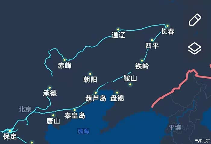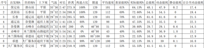 山路起伏和进隧道或匝道限速切换,就和等红绿灯启停一样也挺浪费电。不考虑这些,只参考平原地形,车多均速100码,百公里能耗17+;车少顶着120限速跑,均速110码,百公里能耗19.5+。唐山到沈阳这一节因为有漏记录数据不全,没有放入列表,大概情况就是因为修路几乎全程限速80,均速70+,百公里能耗15+