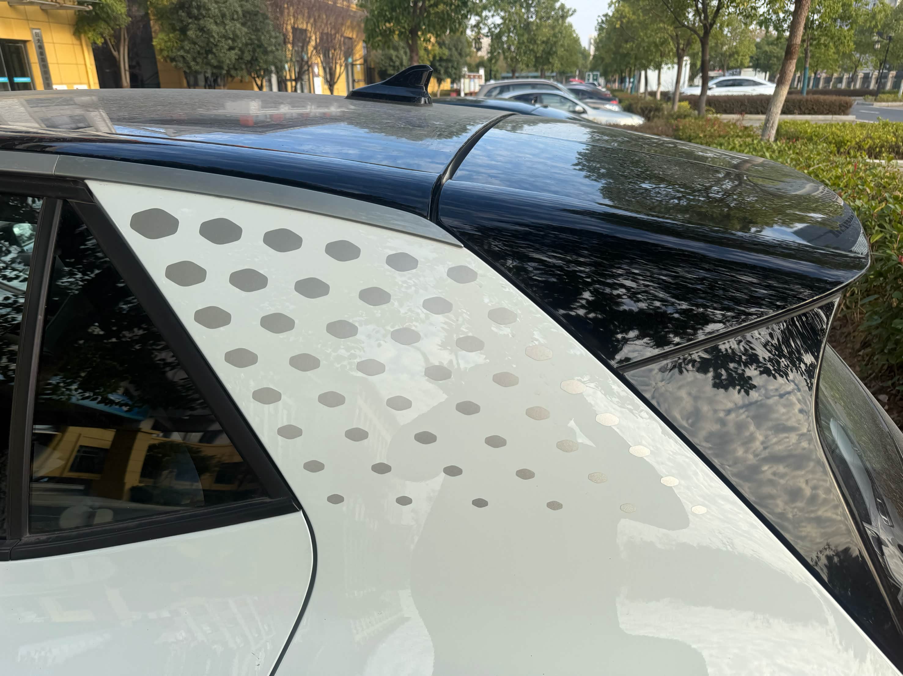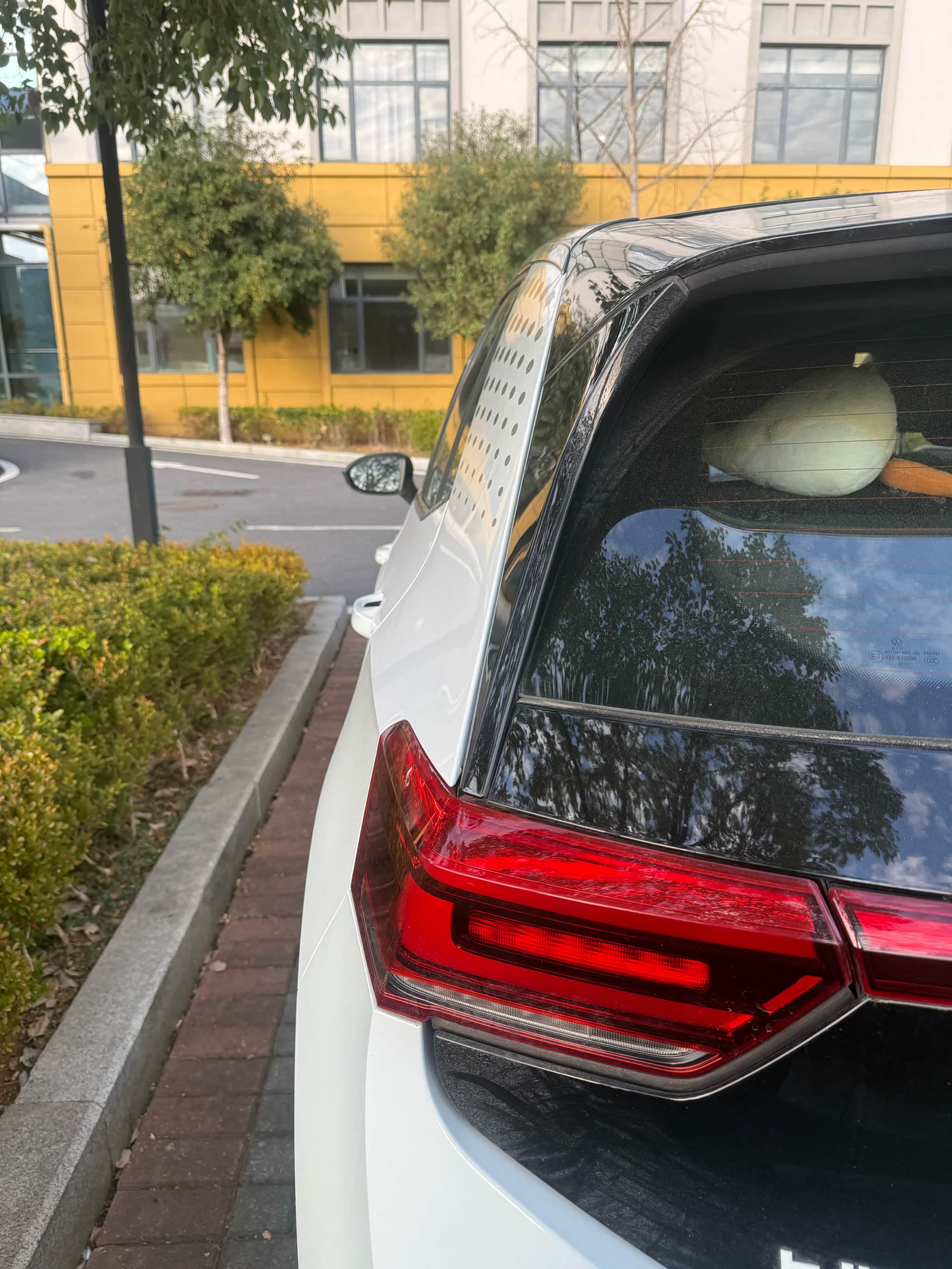 要我说,这辆车的外形设计是它的一大亮点,开在路上辨识度超高。乍一看,可能觉得有点丑、有点怪,但仔细瞧瞧,就会发现还挺耐看的。它采用了大众ID家族的设计风格,和燃油车不太一样。比较亮眼的是熊猫配色,车顶、后视镜以及部分部位都是黑色的,和整体的白色车身形成强烈反差,看上去很有型。尤其是C柱的点状银色贴纸,感觉特别个性。