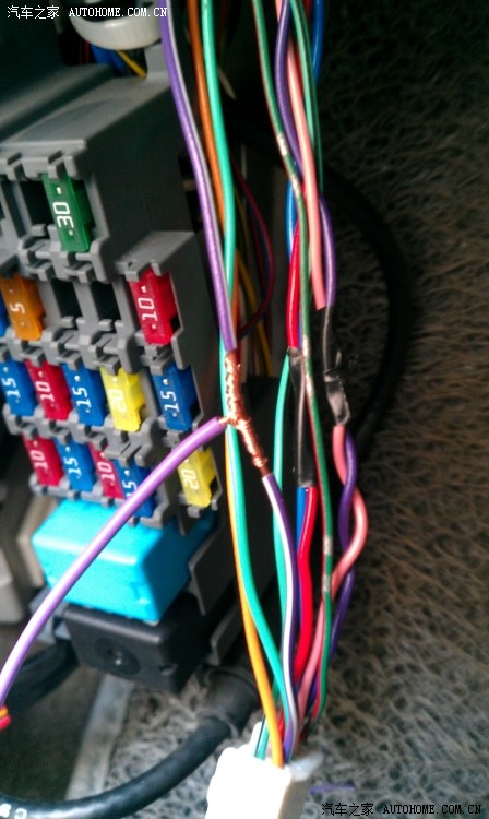 按照相关图纸和说明找到相应的电线,用剥线钳和美工刀将电线绝缘层割去。之前一直纠结于什么叫什么TMD破线,现在知道了,就是如下图中我做的这样,看那条紫色的。