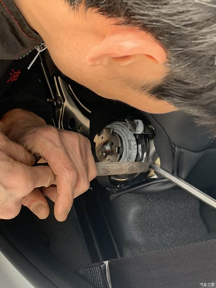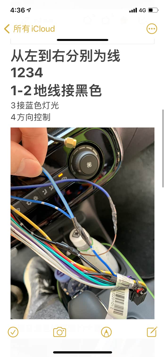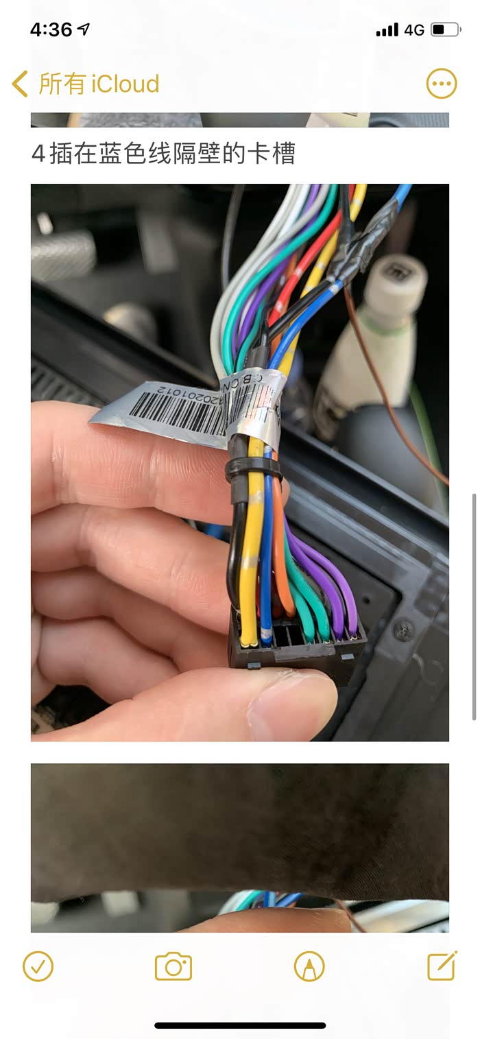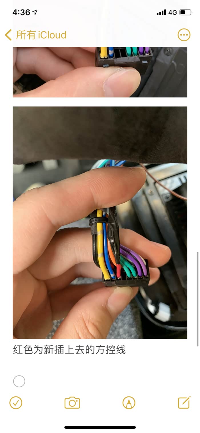 此图为方向盘下边的盖子 需要打开看到黄色的气囊线 这四根线是加上去的 原来没有