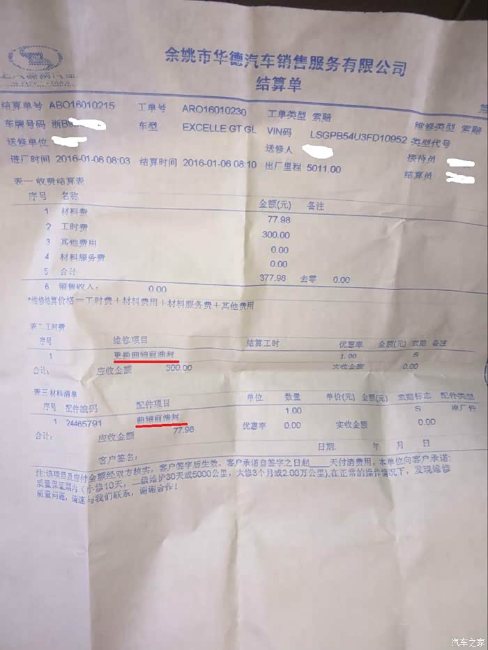 忍痛签字答应更换后,4S让再开段时间,下次保养再去;我直接开了半个月(公里数为5000公里)的时候去复查,前油封再次漏油,4S提出再换一次油封,本人抱着侥幸心理,希望这次换了就不要有问题了;