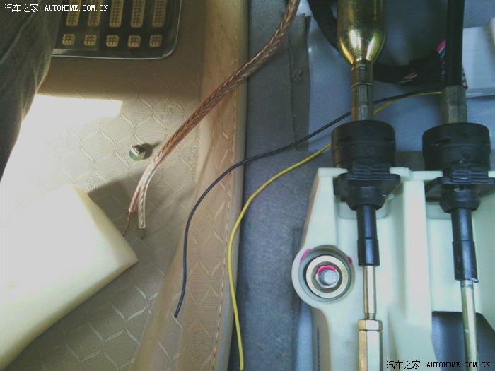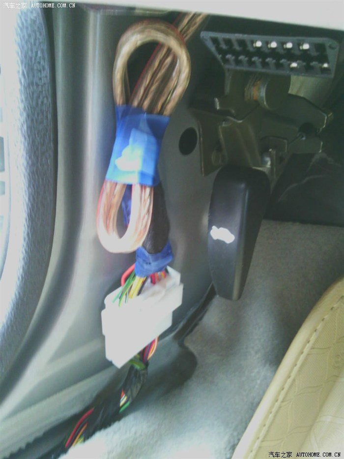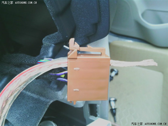 5、下图是驾驶室左下角有个盖板,里边就是连接后门音响的插头,论坛里边的帖子有详细说明,不再重复,直接说一下接线方法,我也是参考“圆梦888”说的找的旧电脑的一些插针自己制作了一下插入到原车插头的空位,再和从收音机头那引过来的线连接就ok了。