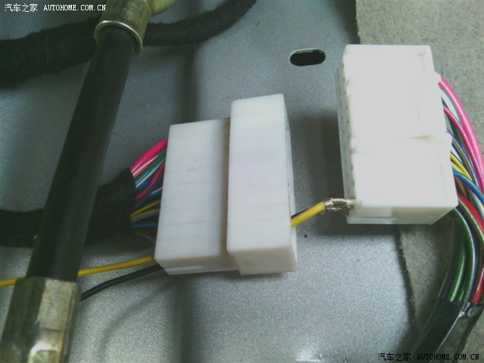 3、和前门的左右音响线并联接后门音响,见下图:上面的这个插头的四根线就是前门音响线,以图片的“上下左右方向”为准说明:左边的两根是左前门的两根线(上为负极,下为正极),右边的是右前门的两根线(上为负极,下为正极)。
