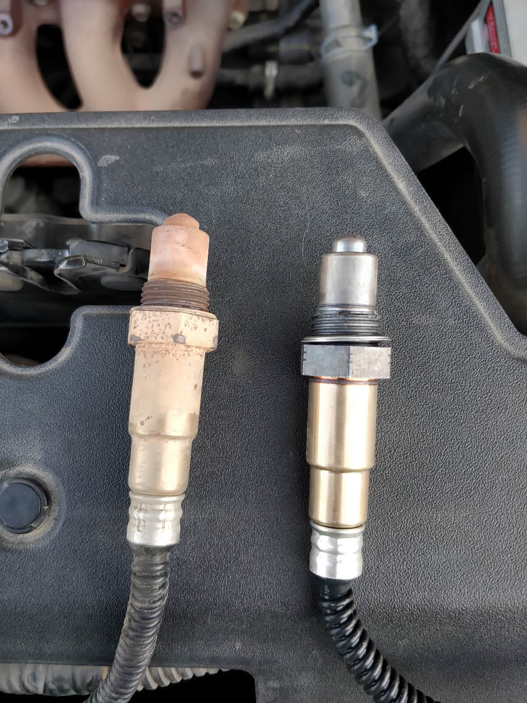 好了,原车的氧传感器已经拆卸完成,看看下图的新旧氧传感器的模样吧