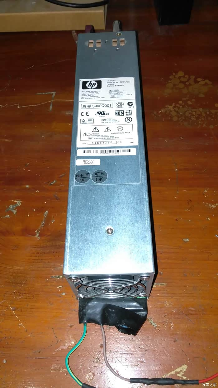 由于目前汽车电瓶是12V,所以自备一个12V的开关电源可以很方便地测试各种车载设备。我用的是HP服务器电源,通过简单的电路跳线就可以在12V输出32A强大电流足以应付车内保险丝限定的各种设备应用。