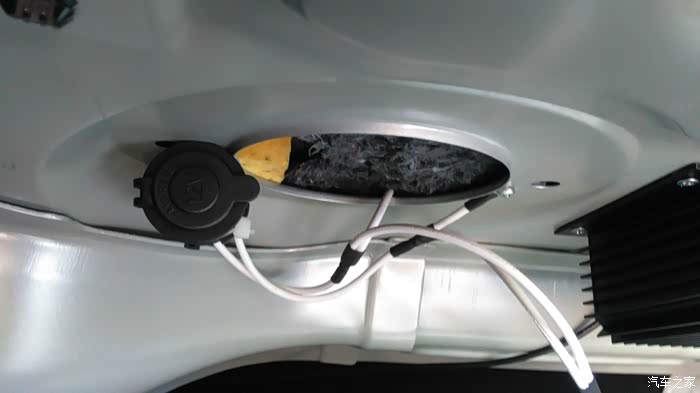 后备箱接的点烟器插座,负极通过攻丝拧叉片搭铁实现,可以方便地搭载车载冰箱、充气泵、吸尘器和逆变器等。傍边引出的线是给功放的。
