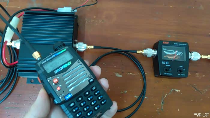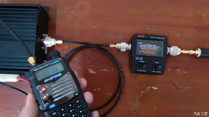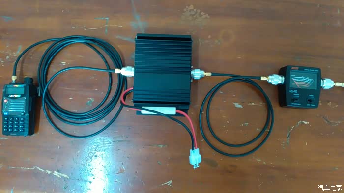 我的手车台系统总成,除了天线部分。功放电源线采用6.3mm T型对插头;宝锋手台天线端口是SMA公头,所以此处需要母-母转换头。
