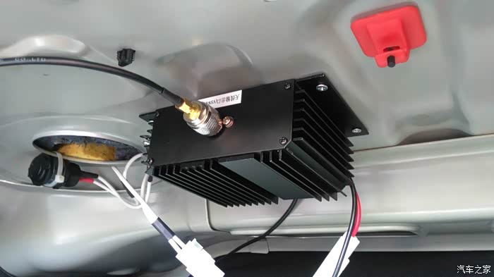 40W功放在后备箱内顶的固定位。由于世嘉内壁铁皮的厚度也就0.7mm左右,所以攻丝4mm,不至于螺距过大卡位松动;为了减震,功放外壳螺孔底部用橡皮胶套自制了减震垫圈。