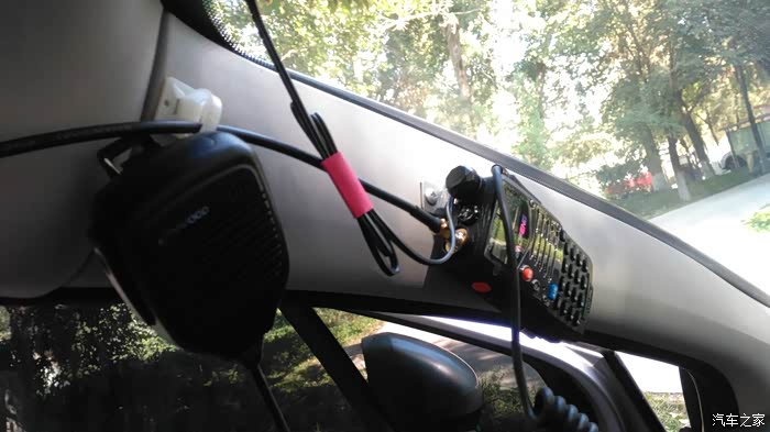 A柱上固定有铝合金挂片,手台背后通过弹性卡子夹在挂片上,可以方便取下;A柱同时有尼龙扎带固定馈线并挂载手咪。在驾驶位可以轻松触及这个位子的手台和手咪。红色线束为手台充电线,可以塞入顶饰板内。