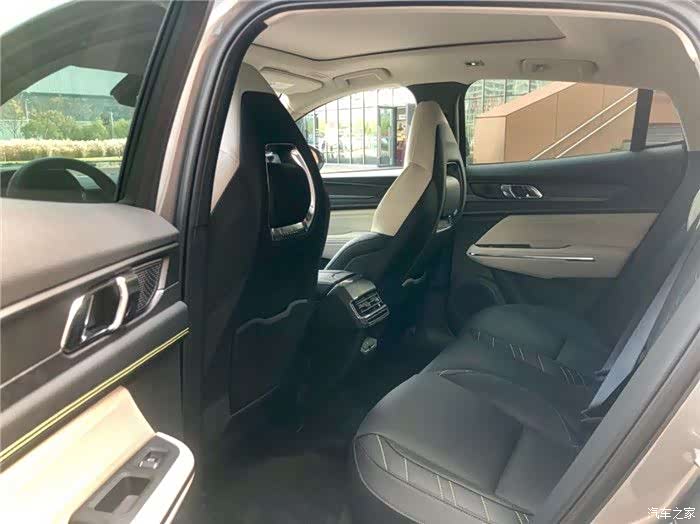从这张照片上很明显能看出来领克05的后排棚顶有一个***的设计,弥补了Coupe车后排低的不足,这样头部空间更好一些,如果再把全景天窗打开,估计效果能更好一些。至于后排的腿部空间,跷二郎腿没什么问题,地板也还是比较平整的,我挺满意这个后排空间。