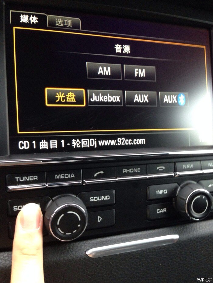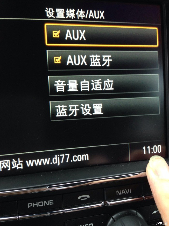 今天提车了。自己摸索了一下,终于把蓝牙摸出来了。废话不说。大家跟我走。首先按那个source键,位于音量键左侧。会出现第一张图所示的页面。未连接蓝牙的话,最后一个AUX是不显示的,请先忽略。