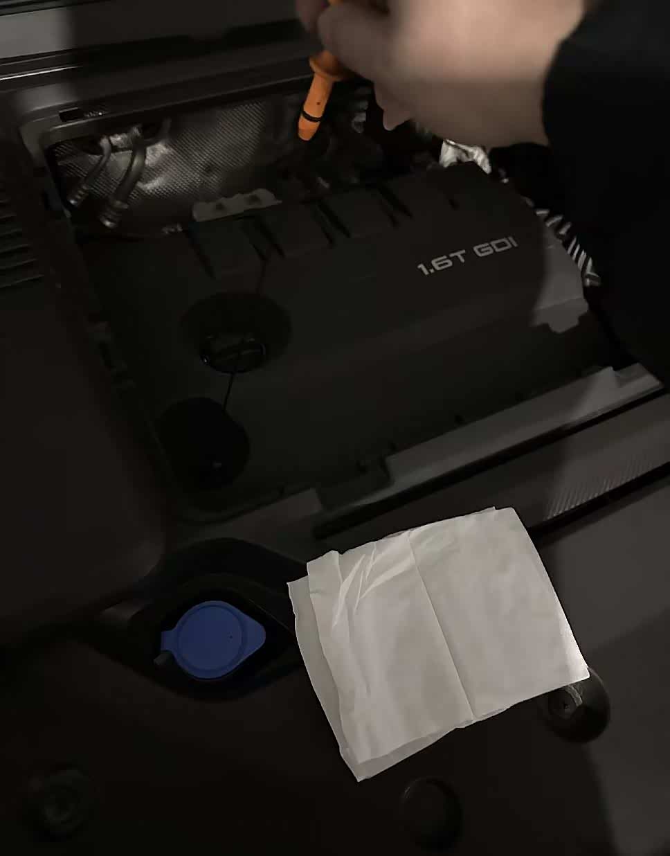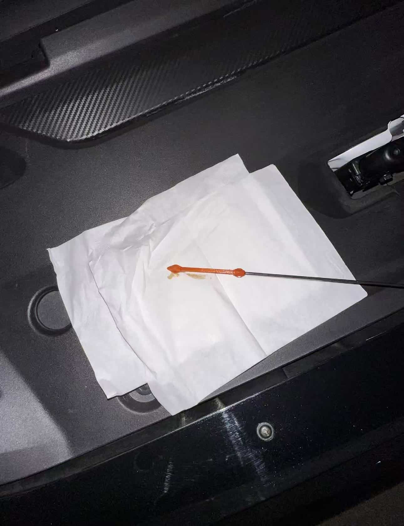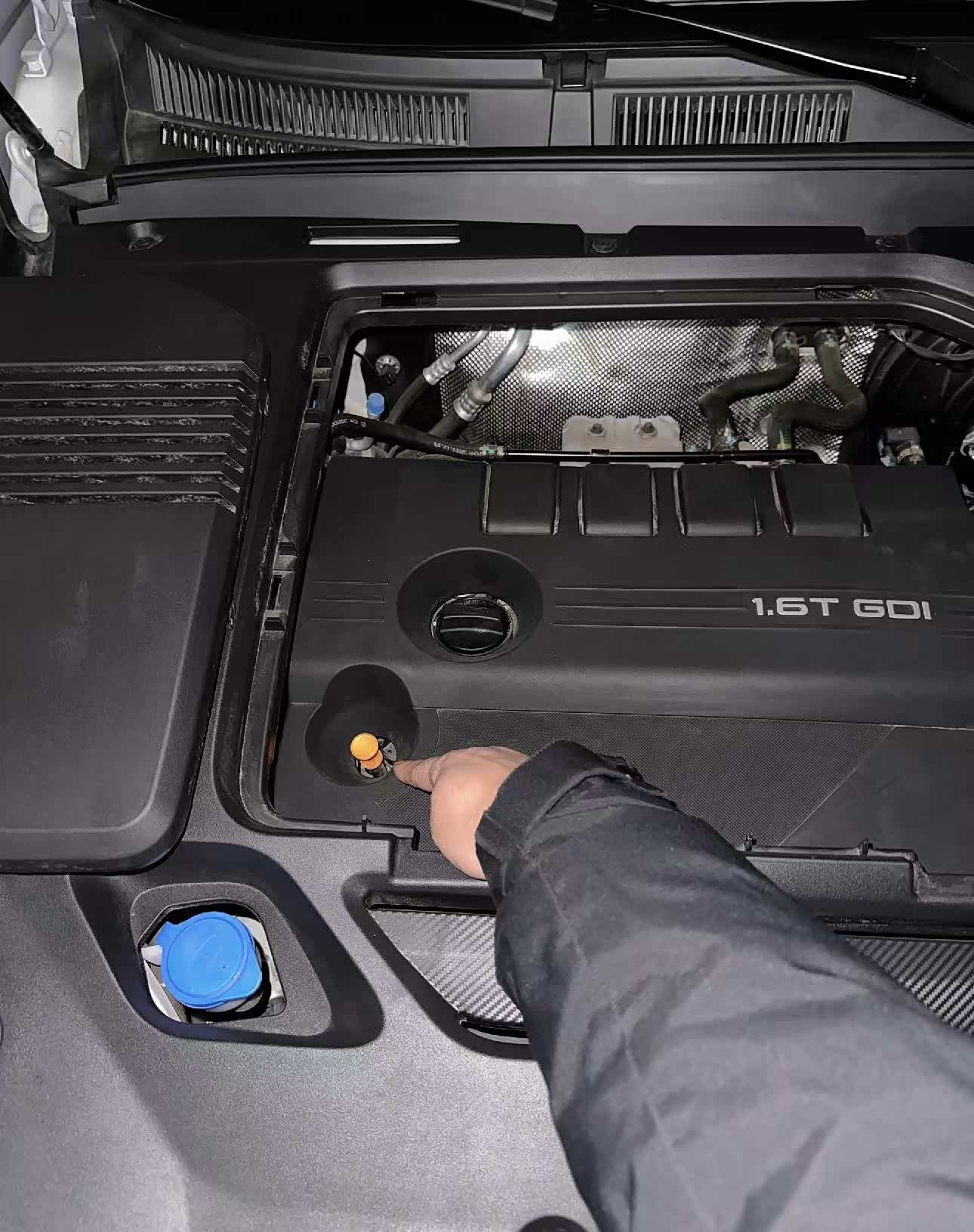 我这次做完保养已经4个多月了,跑了3000多公里,拔出机油尺,现在车辆是静止一天一夜后的状态,正好可以检查一下机油油位。1.6T8Pro说明书上面要求添加4.3(+-0.2)的机油量我是的是添加了4.5升机油,现在的机油尺位置还是上下刻度线的中间,完全没问题!