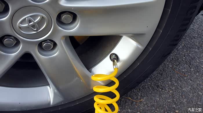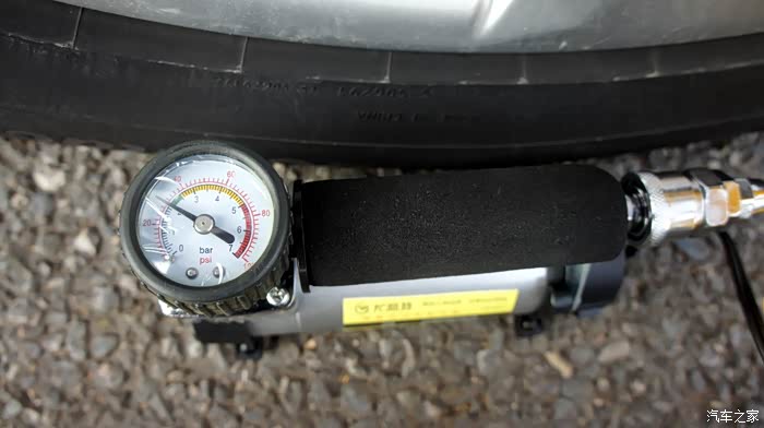 打气泵的气压表会显示此时轮胎的胎压。我这车自从去年年底保养到现在就没调整过胎压,如今只剩下2.0的压力了。正好用气泵自己补充一点。老款车型的厂家推荐胎压是2.2bar,现售的新一代车型是2.3bar。