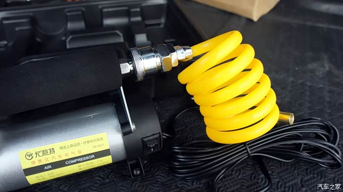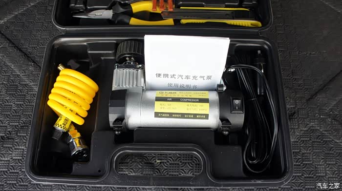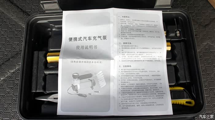 随着工具盒附赠打气泵使用说明书。简要来说就是接12V车载电源,保证车辆是发动状态,给轮胎充气。
