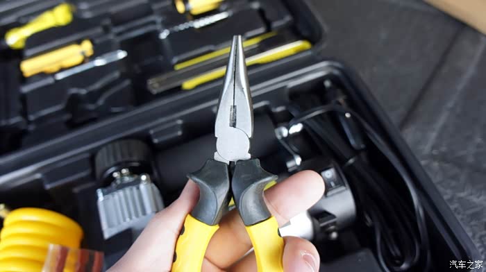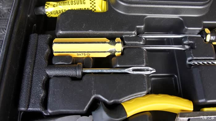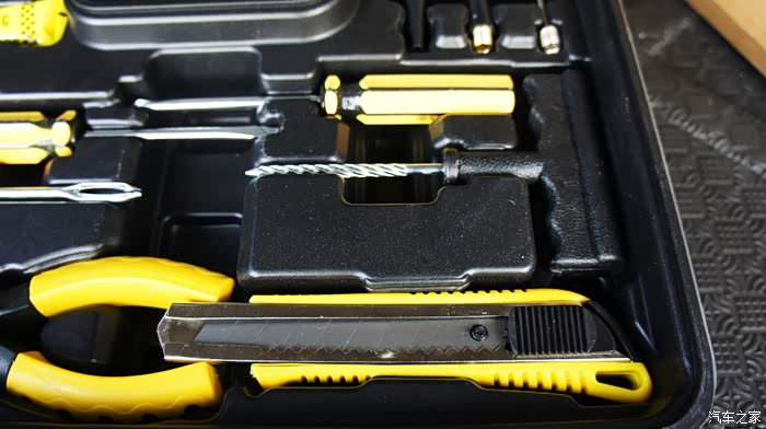 打开盒盖,工具7件套填满了整个箱子。工具明黄色的配色很醒目,也便于驾驶者从工具箱中翻找所需的工具。