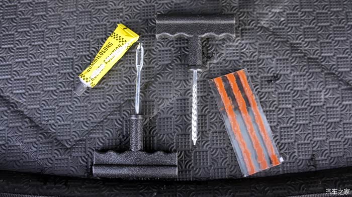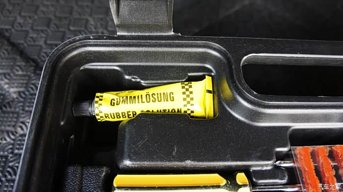 左上角放置的是补胎胶条的胶水。不过外包装没有任何中文标识啊。