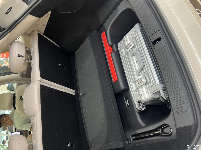 后备箱虽然被后轮转向占了点空间,但是打开这个底板发现下面别有洞天啊。放一个20寸登机箱都绰绰有余,边上还能再塞点东西都成。