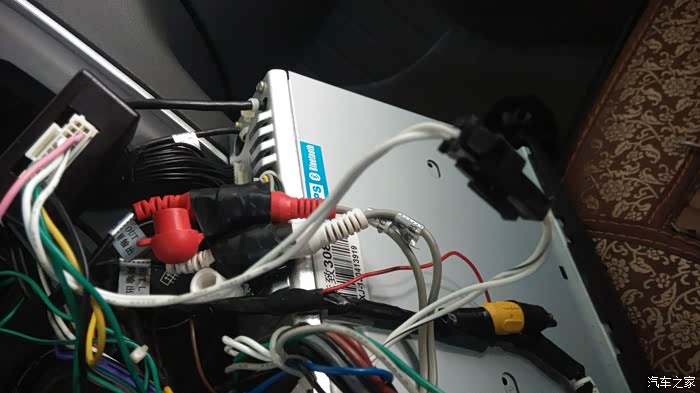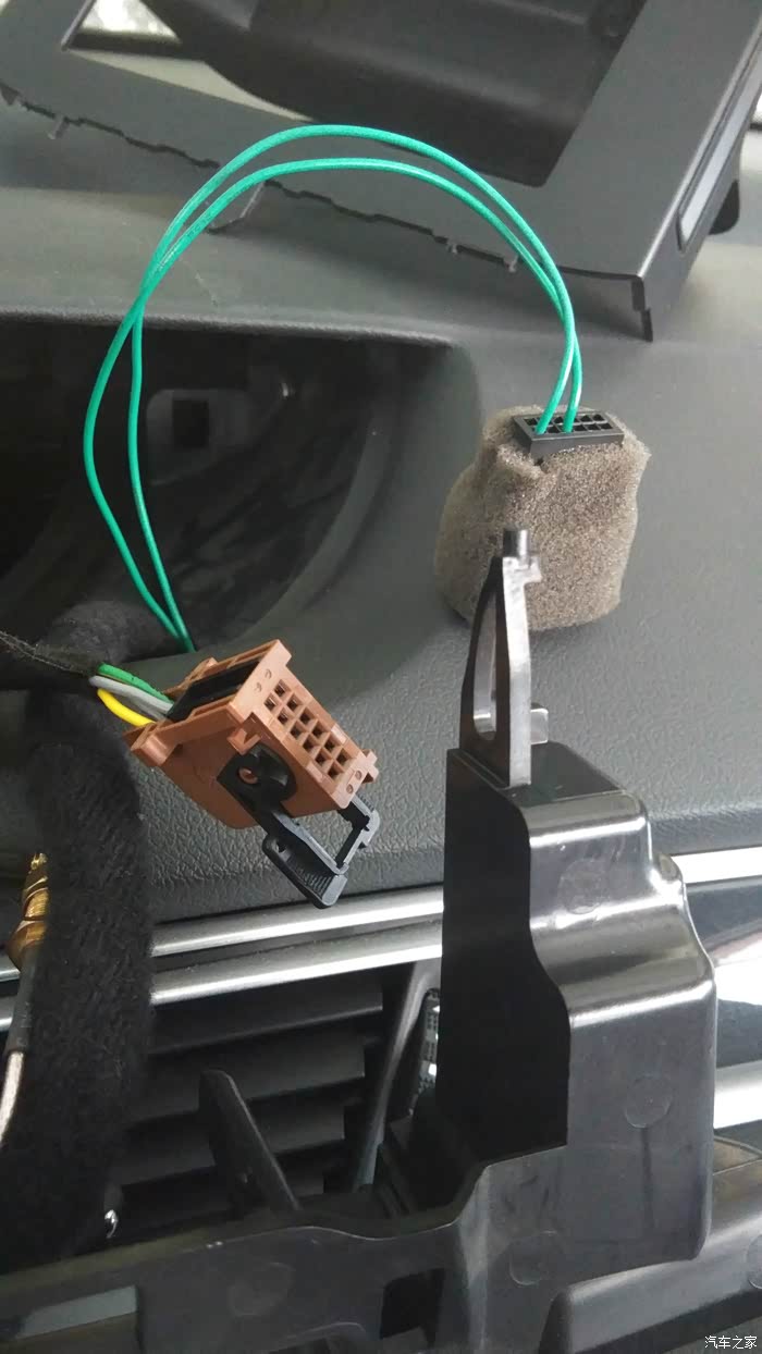 我试验一下,拔掉接DVD机的这两根白色线(中间黑色那里是可拔插的),屏幕果然不能显示原车温度和电脑信息了,接回又能显示正常。