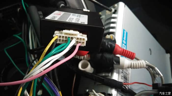 这是导航协议盒,绿色那两根线就是从上面的原车接小屏的线连接下来的,然后经过协议盒,又从白色这两根线再接到导航DVD机里面。