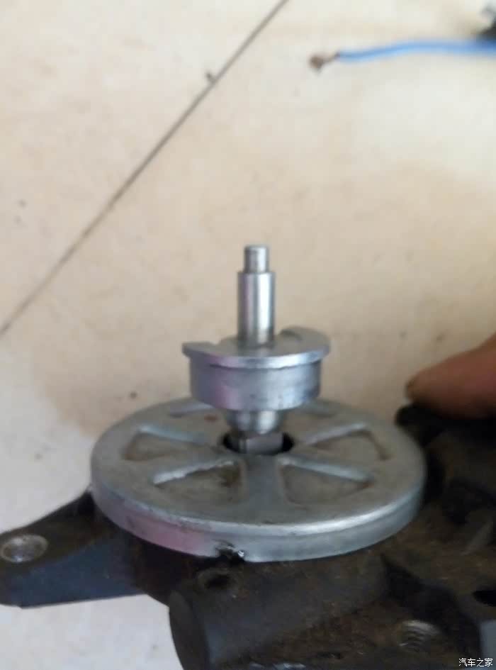 然后把手摇轴磨成电机齿轮轴,拿手摇轴去找车床的叫他改成电机轴,要带电机和轴给看做样板,电机有个铁盖也要钻孔。图片是磨好的手摇轴。