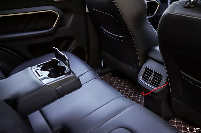 后面有中央扶手丶两个USB接口丶出风口,对后排的乘客照顾的很周到。