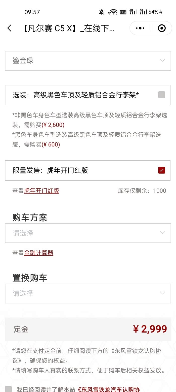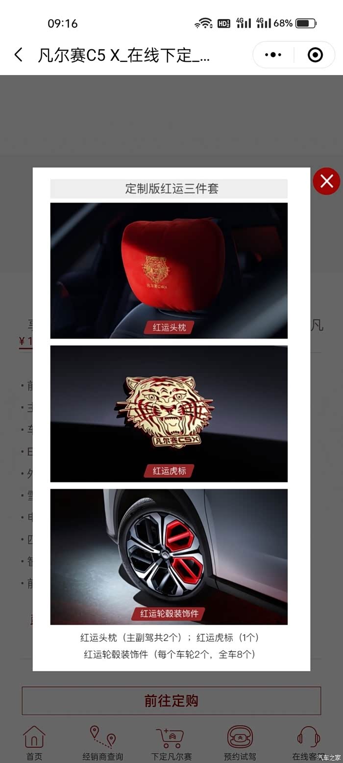 最近凡尔赛C5 X虎年开门红版上市,售价14.37万-18.67万元并限量1000台发售,而这个价格与之前售价保持一致,值得一提的是,红运三件套将同步上线小程序商城,凡尔赛老车主也可以使用4999积分进行购买,也可以根据个人需要单独购买改装件。