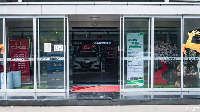 由于河北还在国家一级响应期间,防疫工作不可掉以轻心,门口贴着必须佩戴口罩才能进店的警示,进店后前台放着喷洒式的消毒液,类似于加湿器一样的消毒喷雾,进店前站在旁边转一下即可,额温枪和口罩都有配备,测体温没有问题的情况下可以看车,皓影应该是广本非常重要的车型,所以也是放在进店就能看见的位置,非常显眼。