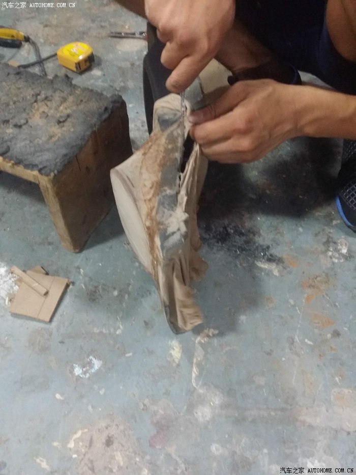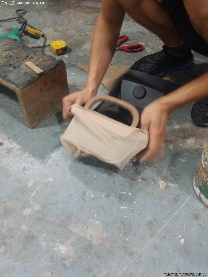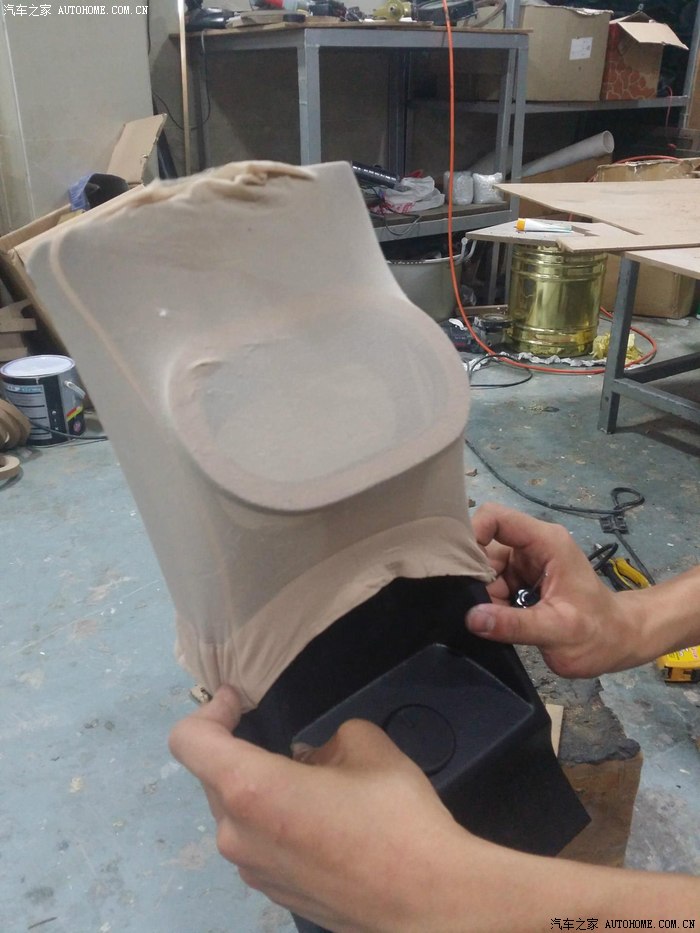 41-扶手箱后面板缝皮安装(经过漫长的等待。。后背板缝皮回来了。。为了保留后排点烟口,缝皮难度大幅度增加。。不过难不倒我们的师傅)