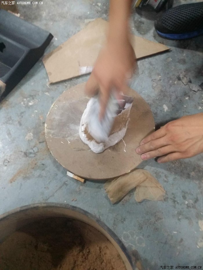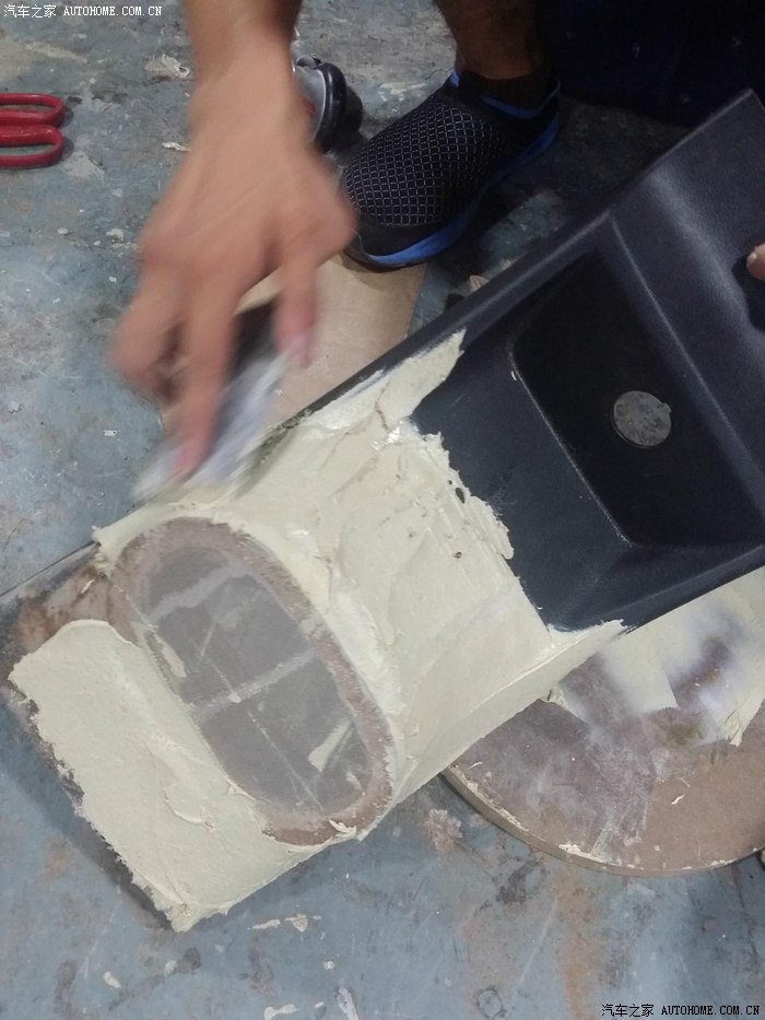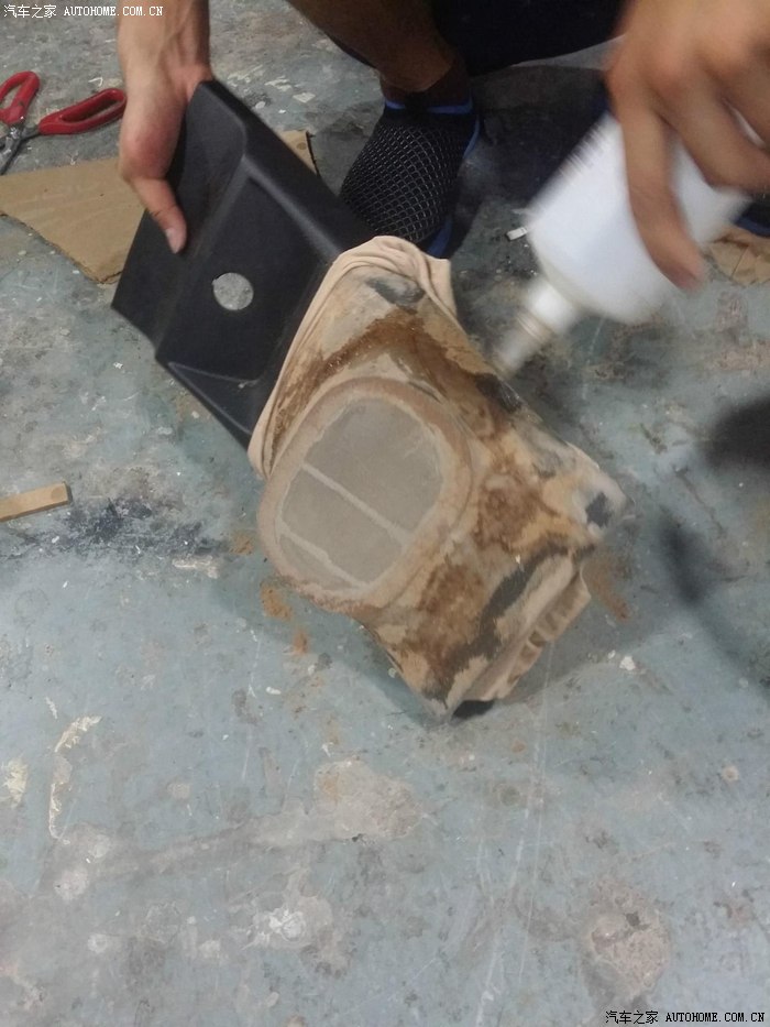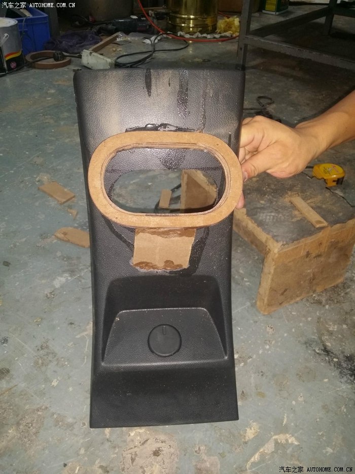 21-扶手箱拆出来用模拟走管确定管道固定隔板(这个是我在这音响改装店,他们的细致周到的成果。。这些隔板,都是经过细致量度尺寸,用机器开戒的。。之后还有减震黑色绒布粘贴。。这就是做音响的手工啊!!!)