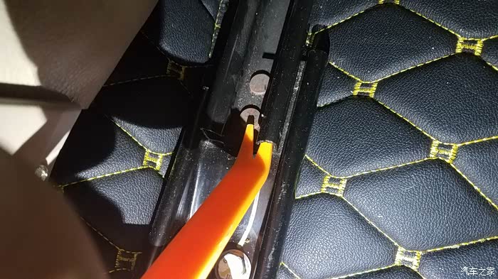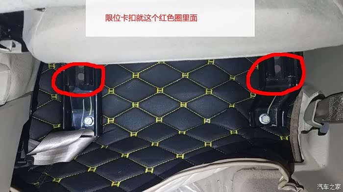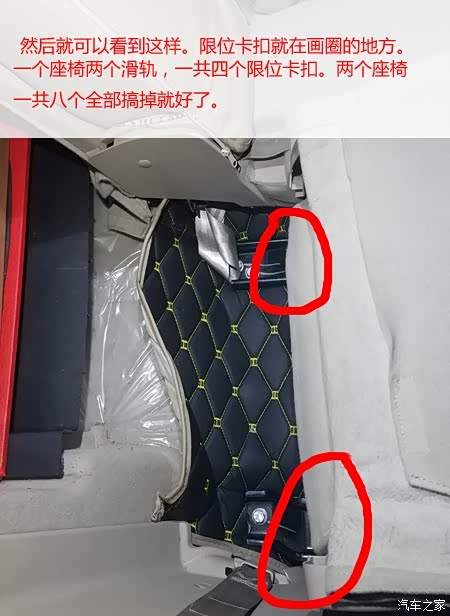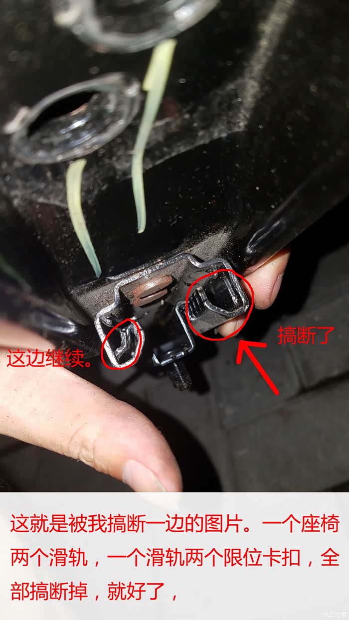 就按这样。把后排的滑轨的限位卡扣都搞断 我是刚开始不懂。 就把滑轨拆下来研究。大家自己动手的时候不需要拆下来。 直接座椅放倒后手伸到后面就可以直接扣限位卡扣了