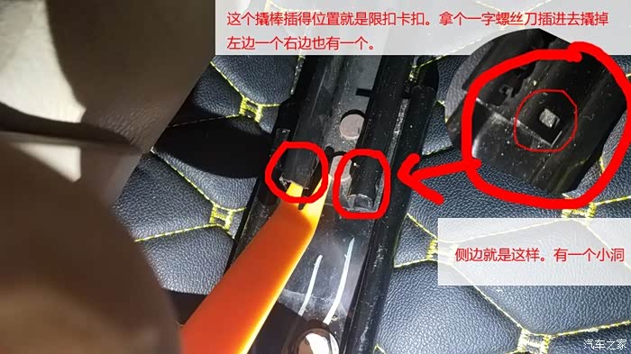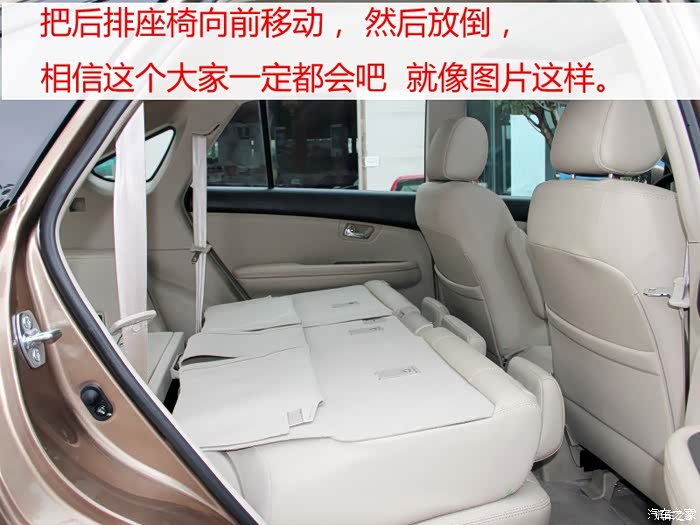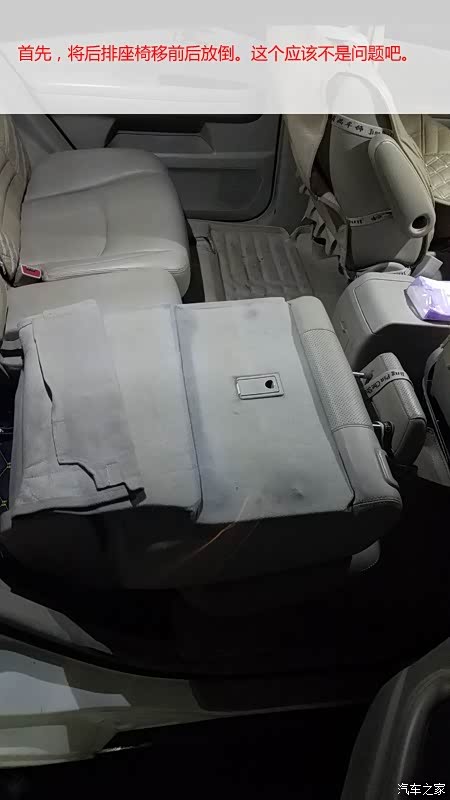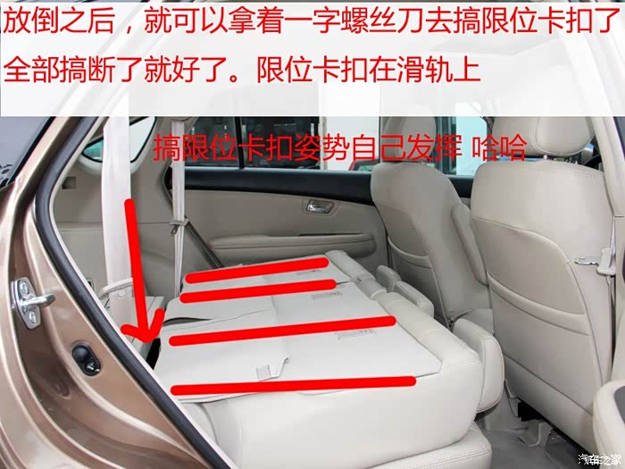 把后排座椅向前移动, 然后放倒, 相信这个大家一定都会吧。 接下来就是拿一字螺丝刀把限位卡扣也扣掉。限位卡扣在座椅滑轨上。大家看我下面的那个图片就知道了。