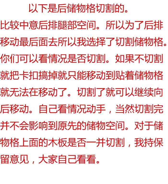 为什么会是后移4到8公分呢?如果你只希望向后面移动四公分,那你就不用把后备箱的那个储物格拆掉。如果你想移动到8公分。那里就得把后面放千斤顶的那个储物格靠座椅的那一侧切割一点掉,用手工锯就可以了。切割了也不会影响到储物格的空间,因为你不切割的话,后排就会顶到那个 就无法更向后移动了。 我的已经切割了。但是没有拍图片。