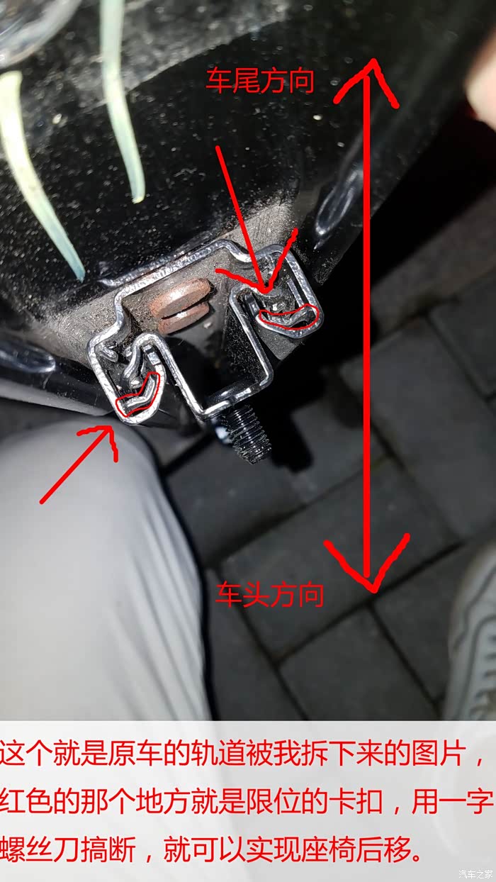 就按这样。把后排的滑轨的限位卡扣都搞断 之后就可以向后移动了。 我是刚开始不懂。 就把滑轨拆下来研究。大家自己动手的时候不需要拆下来。 直接座椅放倒后手伸到后面就可以直接扣限位卡扣了