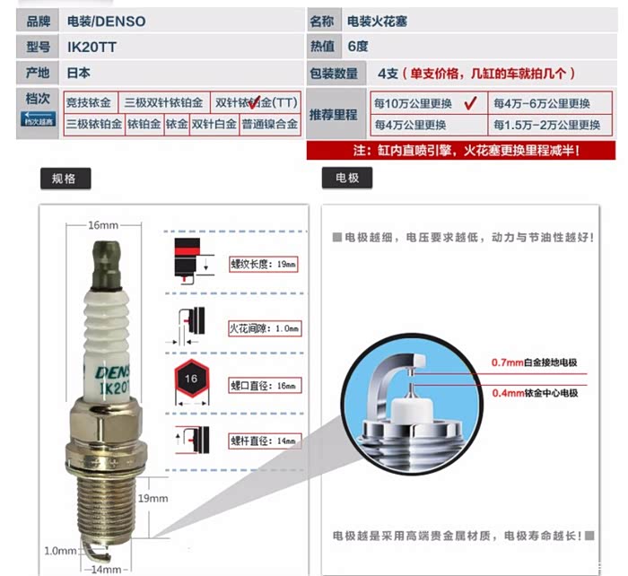 车友用的这款,电装IK20TT,双针铱铂金,200块4个,据说装上后低扭提升明显,这个尺寸和原厂一样,就是热值是6,不知道有啥区别,等下次换这个试试!