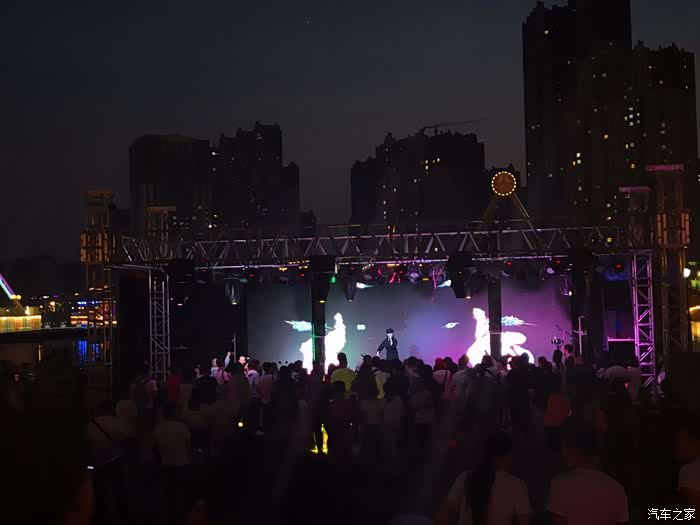 晚上,游乐场外的演出和在广场休闲的人们。