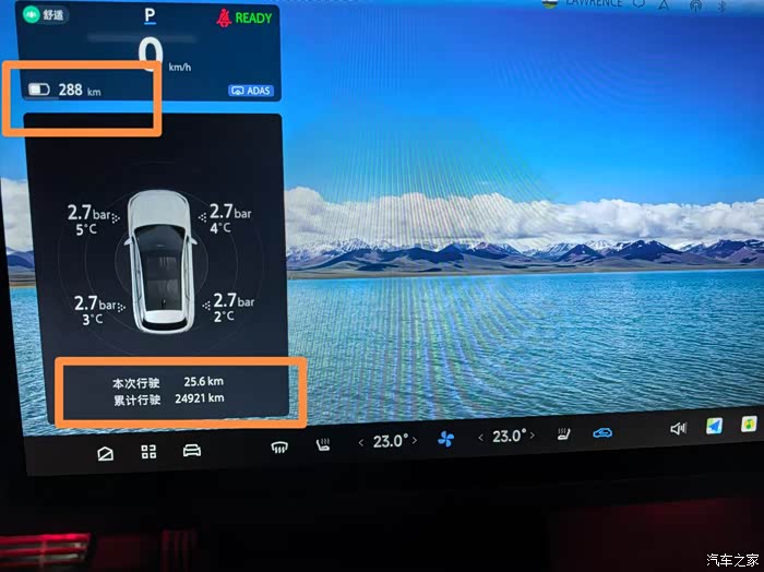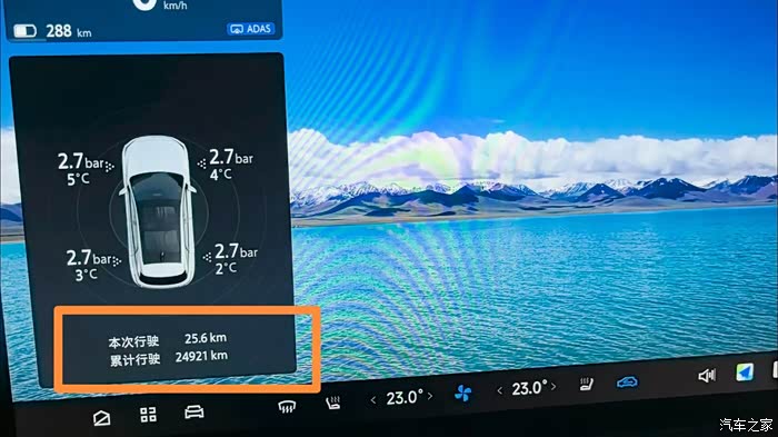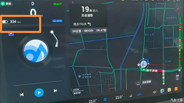 出发时显示:334公里,行驶开25公里后,还剩288公里,掉了46公里,电耗20.6Kwh/100KM(后台数据分析显示,开空调占了23%的电量,其他设备5%)按照65Kwh电量去计算,大概满电行驶315KM,标称是520KM,续航达成率61%。