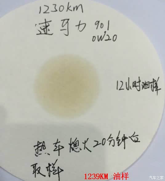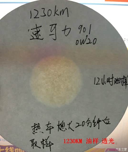 下边上1230KM的油样和161000公里的机油口图片。热车熄火20分钟左右取样,中速试纸,12小时油样: