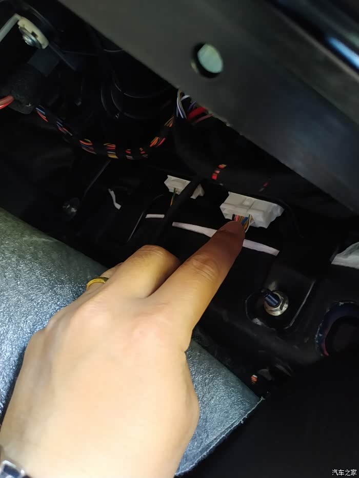 这个就是副驾驶手套箱下面的高音喇叭接线端,靠右边的白色接线排,见手指处