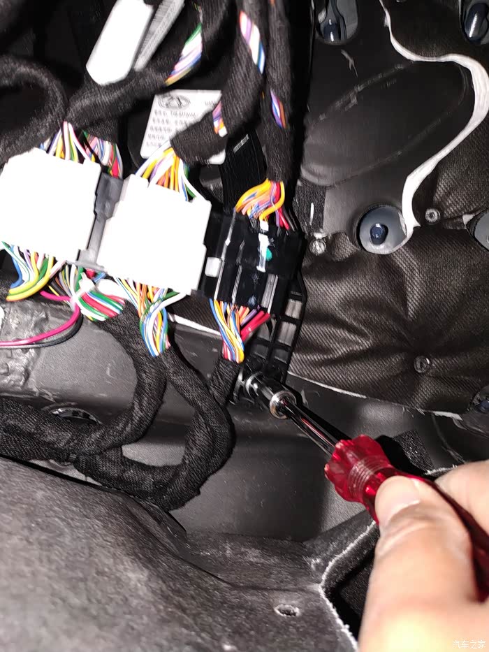 这是主架下面的接线位置,在左脚休息踏板旁边,掀开一点地毯就能看到,主驾这边的高音头线扣在这组线路的背面,为了方便接线建议把整个线组连固定支架一起拆开,拆开右边一颗螺丝,左边是塑料卡扣,用手一扣整体就拆下来了。然后把板子翻开,就能看到需要连接的线卡扣位置