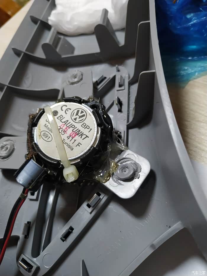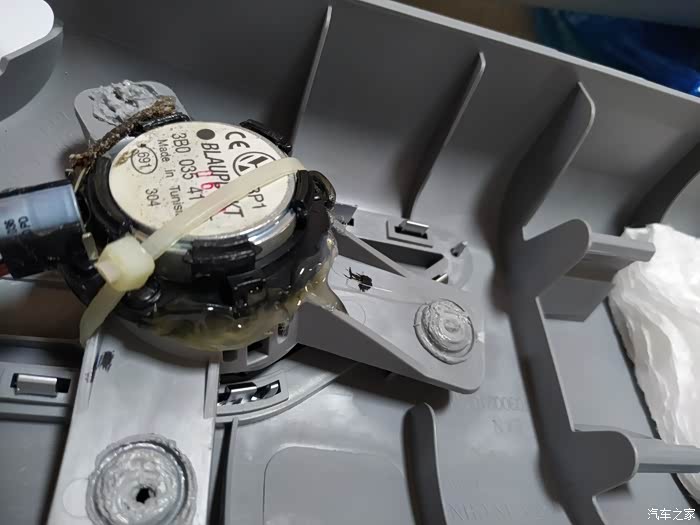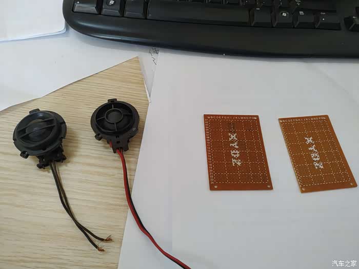 电子焊接用的万能板开孔做喇叭支架,然后螺丝固定在门内饰板上即可