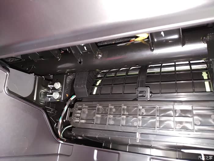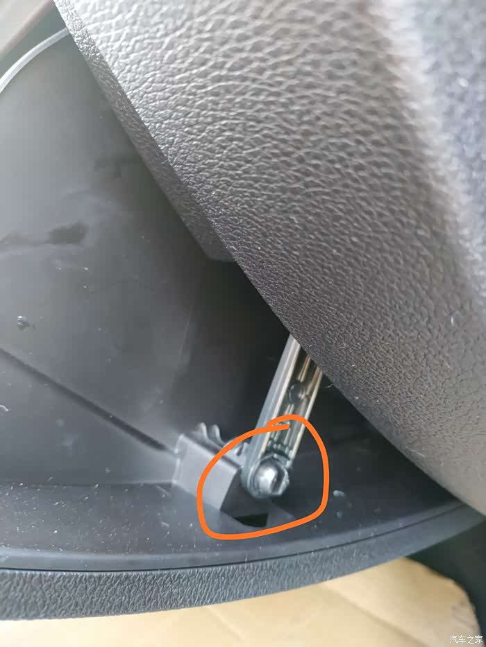 手套箱右边这里就是阻尼器位置,捏住圈中间的位置,就能拿下阻尼器与手套箱的连接杆,此时手套箱就能顺利拆下来,方便接线和穿线