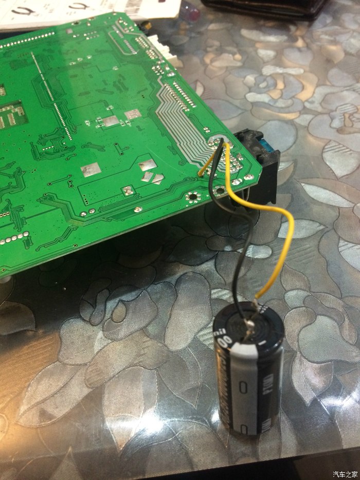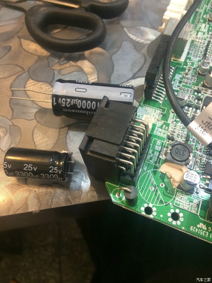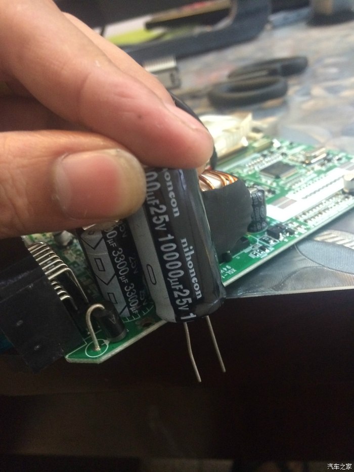 这个是原车的电容!3300UF!其实够用!主要是看你开多大声!别把自己吵聋!
