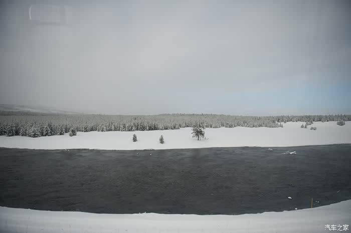 从杰克逊镇到西黄石,都是这样的路。尽管清理过,但路面依然有雪,而且天上还一直下着大雪。这里需要掌握雪地驾驶方法,强制降档,用发动机转速控制车速;不要踩急刹,刹车也尽量少用。在一个大拐弯,我将车从6档逐次降到2档,车速直接就降了下来。如果深踩刹车,很可能就会出问题。另一方面,四驱车还是相对稳定性高一些,雪地开车最好别耍帅租个后驱车玩漂移。美国人开车很快,路上车又少,时不时冲过来几辆车,一定要小心驾驶。