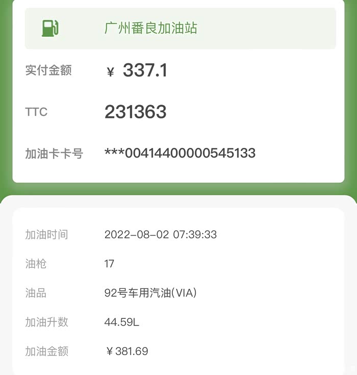今天加油337元,跑了里程620km (常出差,平均时速40km左右),油费也还行。