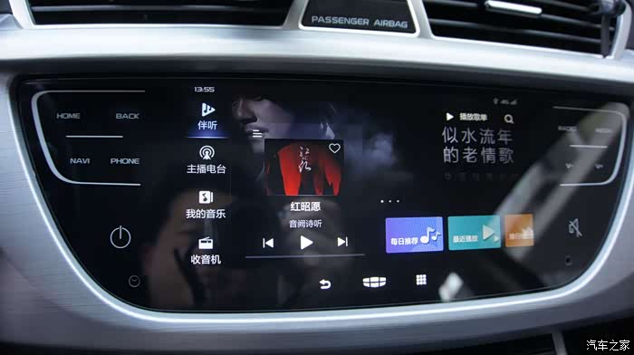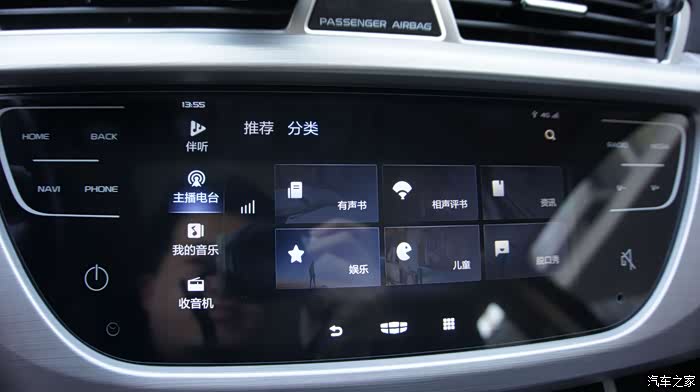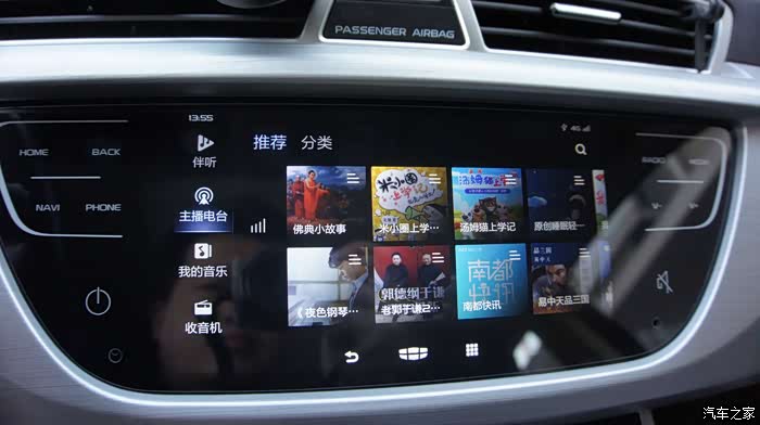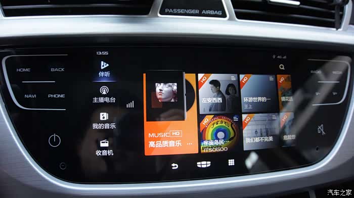 打开多媒体V3.0的界面,可以注意到和以往的多媒体界面有很大不同,在新版多媒体界面中可以看到有伴听、主播电台、我的音乐、收音机四大模块。多媒体智能语音AI功能对听歌场景的全面覆盖,让语音控制能力得到极大提升,用户可以通过语音功能来进行搜索并收听自己喜欢的音乐或者电台