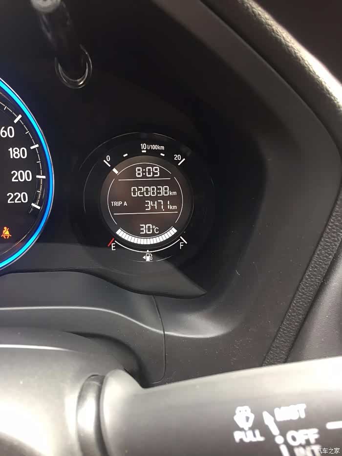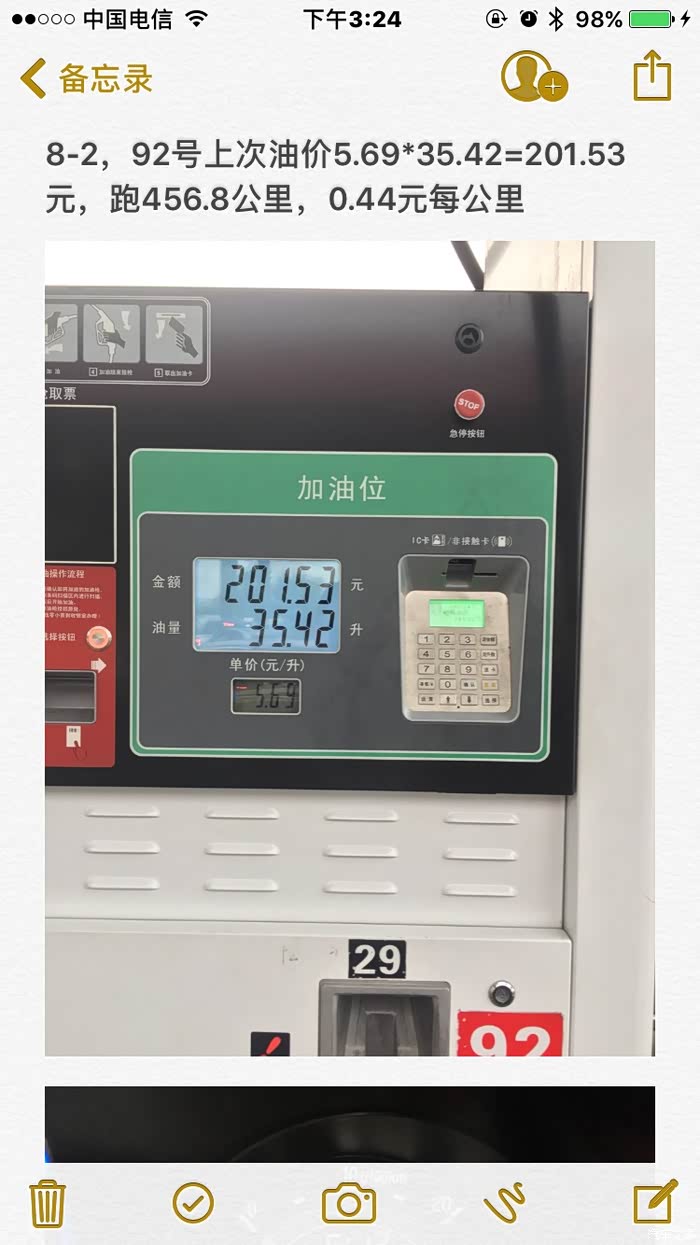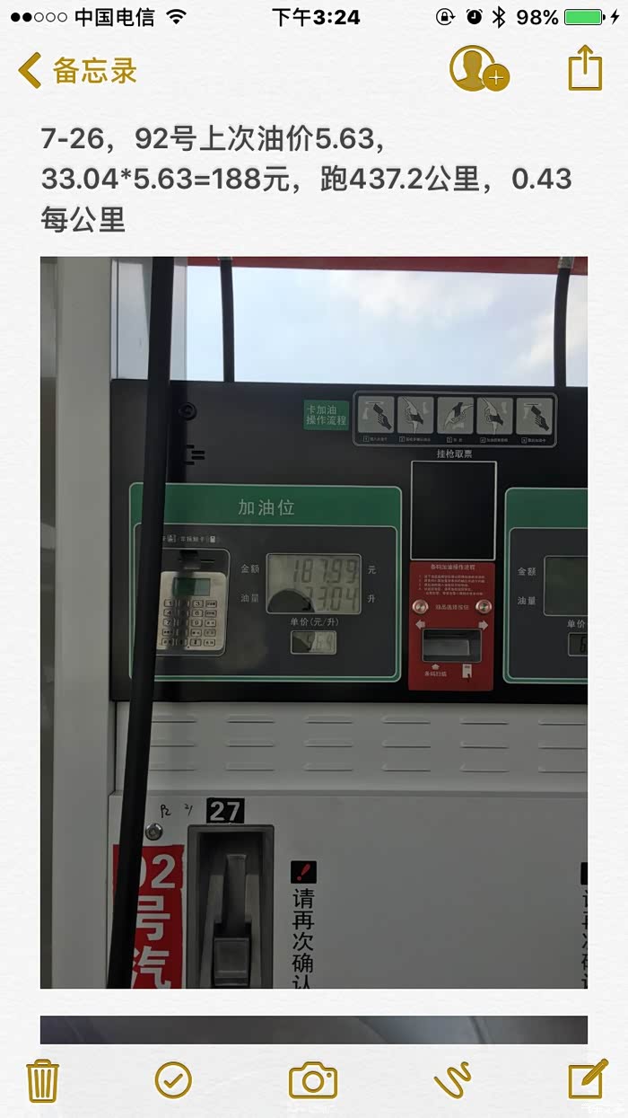 测试开始,油灯亮起后开始尝试加92#,实际数据看图,实测油耗是7.5/百公里。