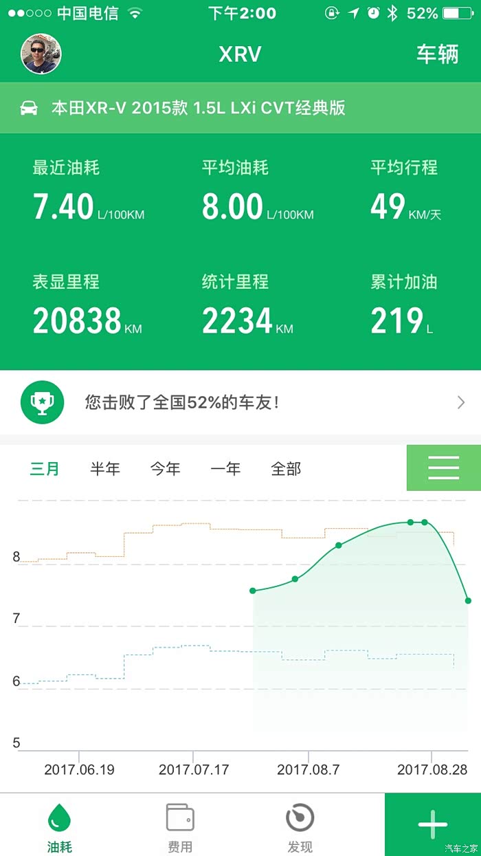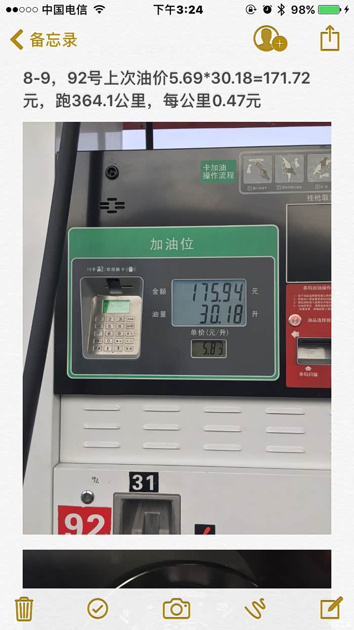 92#测试到此为止,通过小熊油耗的图表看出,加92这一个半月,油耗一直在上升,从7.5升到8.8个,最后一箱油的油耗是5毛一公里。